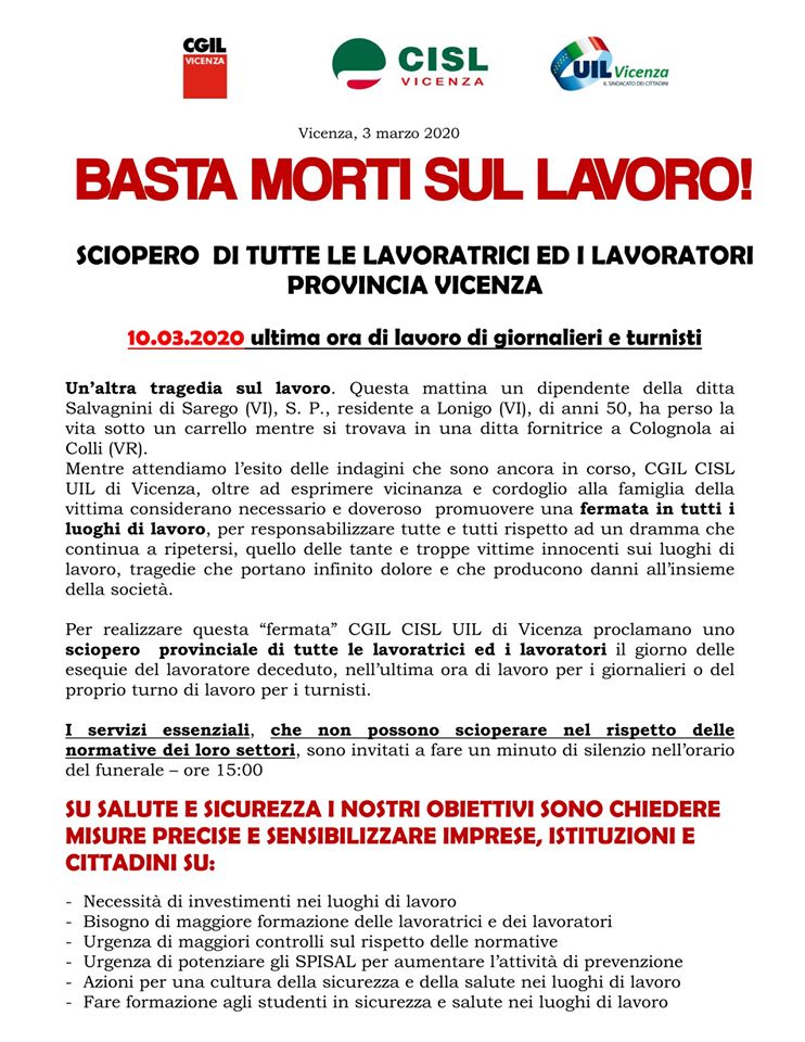 SCIOPERO DI TUTTE LE LAVORATRICI ED I LAVORATORI PROVINCIA VICENZA DI UN’ORA IN CONCOMITANZA CON LE ESEQUIE Un’altra tragedia sul lavoro. Questa mattina un dipendente della ditta Salvagnini di Sarego (VI), S. P., residente a Lonigo (VI), di anni 50, ha perso la vita sotto un carrello mentre si trovava in una ditta fornitrice a Colognola ai Colli (VR). Mentre attendiamo l’esito delle indagini che sono ancora in corso, CGIL CISL UIL di Vicenza,oltre ad esprimere vicinanza e cordoglio alla famiglia della vittima considerano necessario e doveroso promuovere una fermata in tutti i luoghi di lavoro, per responsabilizzare tutte e tutti rispetto ad un dramma che continua a ripetersi, quello delle tante e troppe vittime innocenti sui luoghi di lavoro, tragedie che portano infinito dolore e che producono danni all’insieme della società. Per realizzare questa “fermata” CGIL CISL UIL di Vicenza proclamano uno sciopero provinciale di tutte le lavoratrici ed i lavoratori nel giorno delle esequie del lavoratore deceduto, o in alternativa nell’ultima ora di lavoro per i giornalieri o del proprio turno di lavoro per i turnisti. SU SALUTE E SICUREZZA I NOSTRI OBIETTIVI SONO CHIEDERE MISURE PRECISE E SENSIBILIZZARE IMPRESE, ISTITUZIONI E CITTADINI SU: - Necessità di investimenti nei luoghi di lavoro Altre news