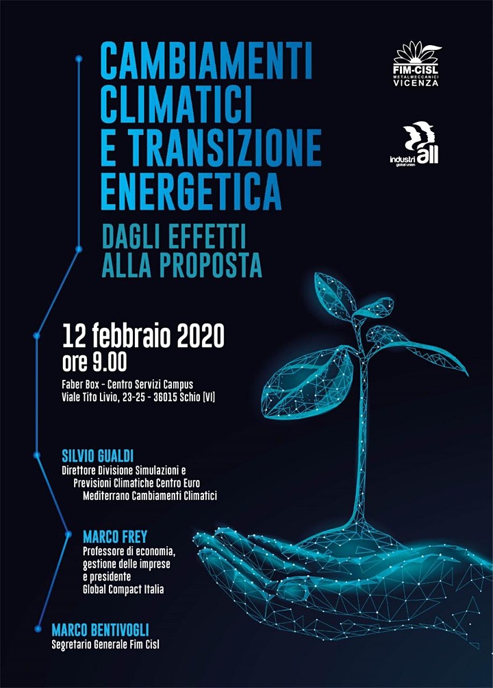 CAMBIAMENTI CLIMATICI E TRANSIZIONE ENERGETICA dagli effetti alla proposta La FIM di Vicenza si confronta sui cambiamenti climatici, la transizione energetica, gli effetti che ne derivano e la proposta di azione sindacale. La cura dell’ambiente non è più una questione rinviabile; scienziati e climatologi ci dicono che il clima sta cambiando e, se non si agisce immediatamente per contenere l’aumento del riscaldamento globale entro 1.5 gradi, entro 10 anni si raggiungerà il cosiddetto “punto di non ritorno”. Una parte della politica e branche della scienza, al contrario, gridano al “complottismo” al solo scopo di agevolare le lobby che cavalcano il tema della green Economy a proprio tornaconto. La FIM invita il prof. Silvio Gualdi (direttore della Divisione Simulazioni e previsioni climatiche del Centro Euro Mediterraneo Cambiamenti Climatici) ad incontrare quadri e delegati sindacali il prossimo 12 febbraio ed avviare assieme un processo di conoscenza ed elevazione culturale che tenga al centro le evidenze scientifiche, per una realistica analisi dei cambiamenti climatici in atto. A fianco del prof. Gualdi sarà ospite il prof. Marco Frey, docente di Economia, gestione delle imprese presso la Scuola Superiore S.Anna di Pisa e presidente di Global Compact Italia. Con lui la FIM vicentina ragionerà sul tema della Green Economy e management ambientale, di gestione efficiente delle risorse e di sostenibilità d’mpresa, che fanno anche parte dei 17 obiettivi ONU nell’agenda 2030 per lo sviluppo sostenibile. L'evento sarà arricchito dalla presenza di Marco Bentivogli, segretario generale della FIM Cisl, che illustrerà l’idea che ha la FIM per rispondere al tema del cambiamento climatico attraverso una azione sindacale efficace. Il sindacato può giocare una partita importante sul terreno delle relazioni industriali, tenendo insieme lavoro, produzione, tecnologia, ambiente e tutela della salute. La FIM in questi anni, attraverso la contrattazione, ha promosso interventi per mettere al centro gli investimenti sulla sostenibilità, per un rilancio industriale nella convinzione che, senza lavoro, le imprese ed i lavoratori non hanno futuro. Anche nell’organizzazione del lavoro ci sono spazi di azione. In molti accordi sindacali già sottoscritti, un peso significativo è stato assunto dal capitolo della conciliazione tempi-vita lavoro, per esempio, attraverso l'uso dello smart-working, che permette di limitare gli spostamenti con conseguente riduzione di traffico veicolare ed inquinamento. Per la FIM diventa fondamentale porsi degli obiettivi ambientali strutturali a medio termine ed imboccare la strada del futuro accompagnando i processi senza lasciare indietro nessuno, sdoganando quei “No” che, in alcuni casi, hanno fatto chiudere le imprese, lasciato a casa i lavoratori ed, indirettamente, inquinato l’ambiente circostante, abbandonando le aree industriali danneggiate. Per la FIM inoltre, diventa strategico puntare su uno sviluppo dell’economia circolare. Riciclo e riutilizzo devono entrare nel nuovo paradigma dell’impresa 4.0, così come investire sulla mobilità sostenibile pubblica e privata, realizzando le infrastrutture necessarie a renderla fruibile ed accessibile a tutti. Puntare sullo sviluppo delle energie rinnovabili per abbandonare il combustibile fossile entro il 2025. Ridurre lo sfruttamento del suolo, riqualificare e rendere sostenibili fabbriche, abitazioni e città. Queste sono alcune proposte da coltivare per centrare l’obiettivo della sostenibilità ambientale; proposte che possono creare lavoro e occupazione di qualità. Indirettamente potranno diventare una risposta concreta e percorribile, in antitesi alla logica perversa e perdente dei dazi. Solo spostando la competitività delle imprese sul terreno della sostenibilità (con il sostegno di misure fiscali a favore di chi investe in favore della sostenibilità ambientale), sarà possibile vincere la sfida della compatibilità fra lavoro e territorio ed affermare che lo sviluppo industriale e la tutela dell’ambiente sono compatibili. Gli invitati e gli ospiti ne discuteranno con i quadri ed i delegati della FIM di Vicenza in occasione dell'evento che si terrà il 12 FEBBRAIO 2020