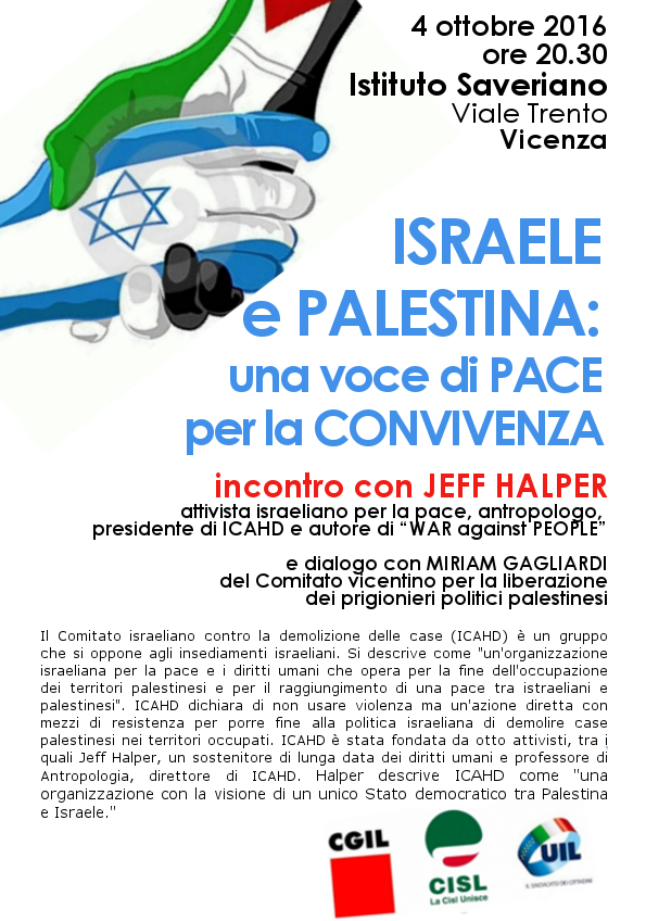 Il 4 ottobre 2016 alle ore 20.30 ISRAELE e PALESTINA: incontro con Jeff Halper attivista israeliano per la pace, dialogo con Miriam Gagliardi del Comitato vicentino per la liberazioneAppuntamenti in agenda