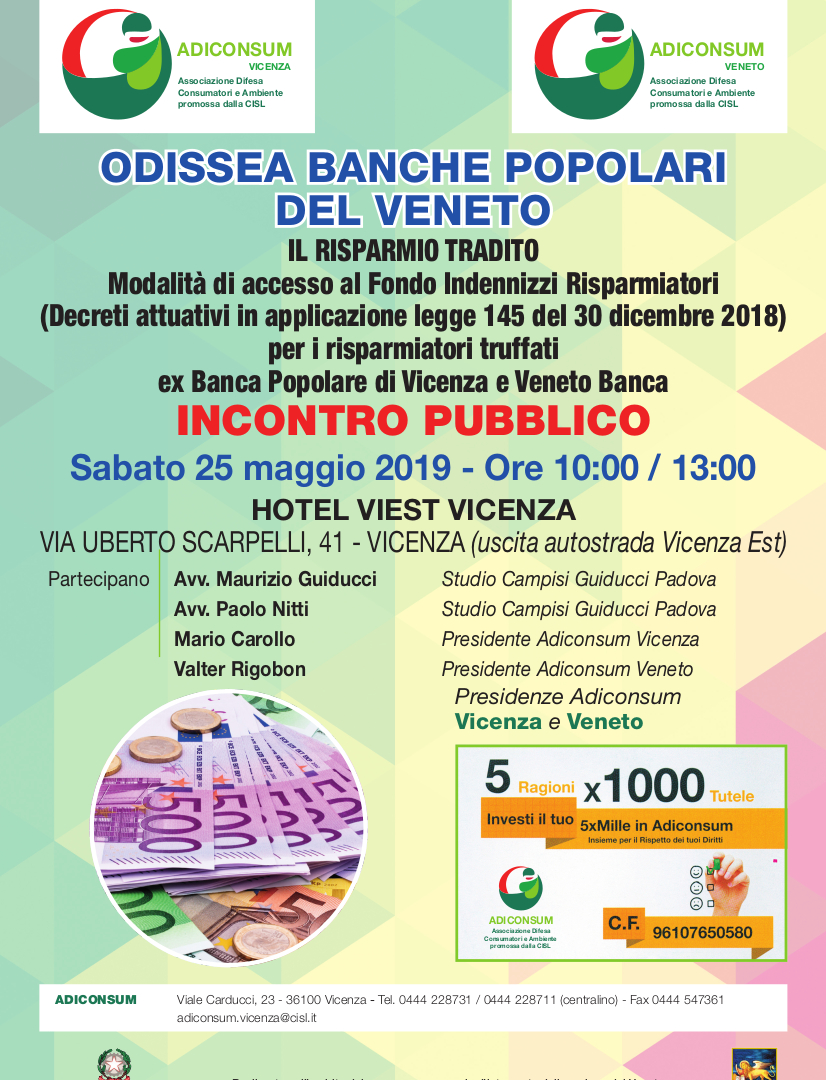 ODISSEA BANCHE POPOLARI DEL VENETO IL RISPARMIO TRADITO ADICONSUM VICENZA E VENETO ANNUNCIANO UN INCONTRO PUBBLICO PER SABATO 25 MAGGIO 2019, DALLE ORE 10:00 ALLE 13:30, AL VIEST HOTEL (uscita autostrada Vicenza Est), riguardo le Modalità di accesso al Fondo Indennizzi Risparmiatori (Decreti attuativi in applicazione Legge 145 del 30 dicembre 2018) per i risparmiatori truffati ex BPVI e Veneto Banca. Venerdì 10 maggio scorso il ministro dell’Economia e delle Finanze Giovanni Tria ha firmato i decreti attuativi, in applicazione legge n. 145 del 30 dicembre 2018, per i risparmiatori truffati ex Banca Popolare di Vicenza e Veneto Banca. Gli indennizzi saranno parametrati al costo d’acquisto che sarà del 30 % per le azioni e del 95% per le obbligazioni subordinate, inclusi gli oneri fiscali, entro il limite massimo complessivo di 100.000 euro per ciascun risparmiatore. Nel corso della riunione Adiconsum fornirà chiarimenti sui decreti attuativi e sulla documentazione per presentare la domanda di rimborso del 30%. Sei invitato a partecipare all’iniziativa. Tel. 0444 228731 0444 228711 Presidenze Adiconsum Vicenza e Veneto.Altre news