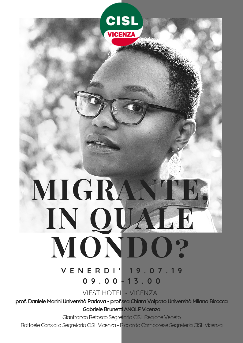 Carissime/i, siete invitati al convegno di approfondimento su temi del lavoro, delle migrazioni, della società, che si terrà: venerdì 19 luglio 2019 dalle ore 9 alle ore 13, presso il Viest Hotel in Via Uberto Scarpelli 41 a Vicenza. Nell'incontro del febbraio scorso abbiamo parlato del migrante straniero e del suo rapporto con il lavoro e la società; ora vorremmo allargare lo sguardo dalla figura in primo piano al contesto ed alla cornice. Ci guideranno nel percorso il prof. Daniele Marini dell’Università di Padova, che affronterà il tema della globalizzazione, dell'inverno demografico e dei loro riflessi nel mercato del lavoro e la prof.ssa Chiara Volpato dell’Università Milano Bicocca, che approfondirà il tema della disuguaglianza, delle relazioni sociali, dell'appartenenza. Presenti anche Gianfranco Refosco Segretario CISL Veneto e Raffaele Consiglio Segretario CISL Vicenza. VOLANTINO 19.07.2019 Convegno ANOLF CISL VICENZA ANOLF VICENZA (Riccardo Camporese) (Gabriele Brunetti) Altre news