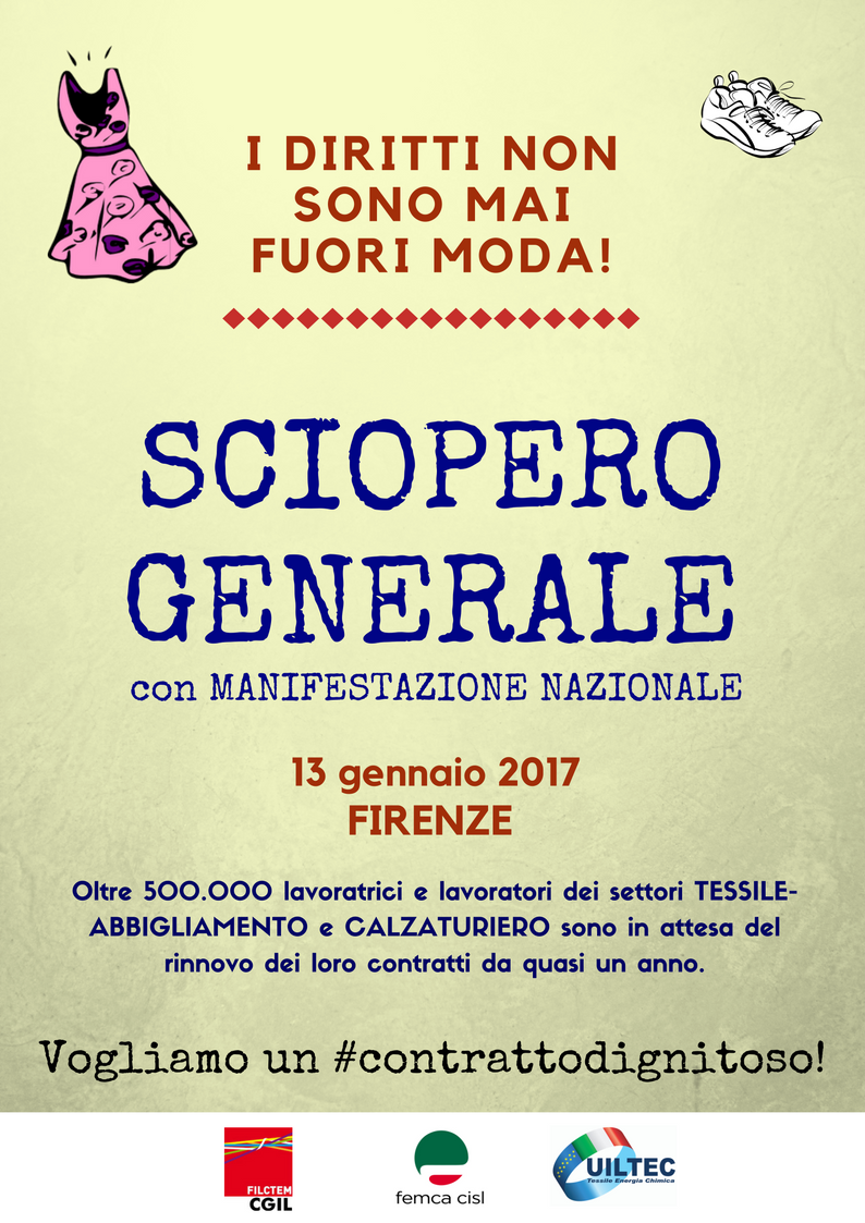 Vogliamo un #contrattodignitoso. Con questo slogan le categorie Tessile-Abbigliamento e Calzaturiero di CGIL, CISL e UIL si danno appuntamento per una manifestazione nazionale il 13 gennaio a Firenze, in occasione della chiusura del Pitti Uomo. Lo sciopero per il mancato rinnovo del contratto, in attesa ormai da un anno. Sciopero Generale 13.01.17 indicazioni logistiche E' fondamentale aderire allo sciopero e partecipare alla manifestazione, ne va del futuro del contratto nazionale!!! I pullman partiranno alle ore 6,00 da VALDAGNO di fronte alla stazione delle corriere ore 6,00 da SCHIO in Piazzale Pubblici Spettacoli (vicino alle piscine) ore 6,15 da QUINTO VICENTINO presso la FORALL via Fabio Filzi ore 6,15 da MONTECCHIO MAGGIORE dal BOWLING via Nogara ore 6,15 da THIENE dal parcheggio località del BOSCO ore 6,30 da VICENZA EST IMPORTANTE!!!! le adesioni alla manifestazione dovranno essere comunicate alle RSU o ai funzionari di riferimento entro MERCOLEDì sera.Altre news