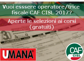 SONO APERTE LE SELEZIONI AI CORSI GRATUITI PER OPERATORI/TRICI FISCALI 2017. L’AGENZIA PER IL LAVORO UMANA E CISL VENETO SERVIZI La nostra offerta si rivolge ad utenti disoccupati (o occupati part-time). I candidati ideali possiedono buona dimestichezza nell’utilizzo del pc e predisposizione per l’imputazione rapida e corretta dei dati. Gradite precedenti esperienze in ambito amministrativo. Completano il profilo: precisione, buona predisposizione al rapporto diretto con il pubblico e attitudine al lavoro in team. E’ necessario compilare la procedura On-line tramite il seguente link, verranno prese in considerazione solamente le procedure completate.Altre news
