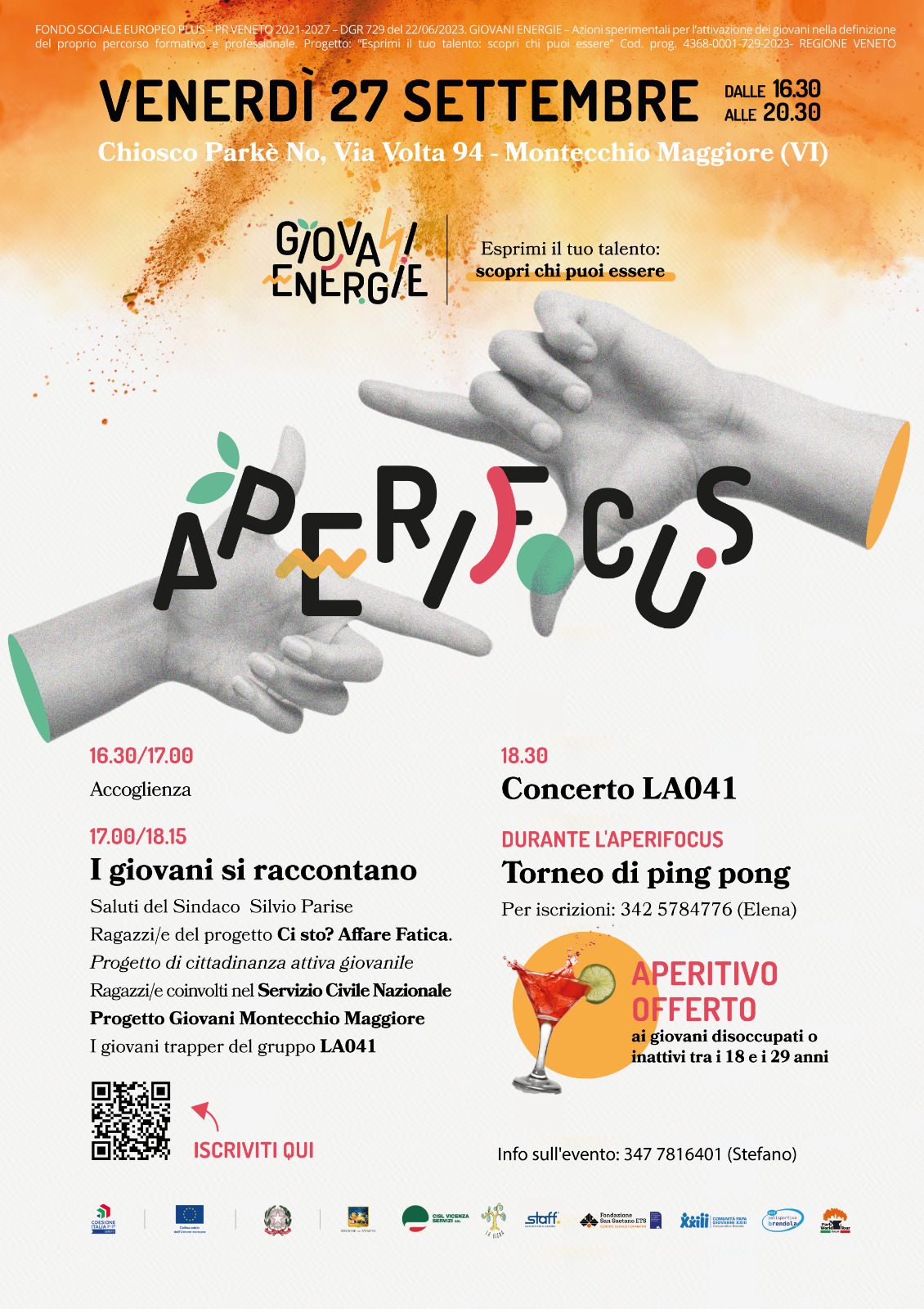 Siamo lieti di invitarvi all'evento "AperiFocus" organizzato nell'ambito del Progetto Giovani Energie, che si terrà venerdì 27 settembre presso il Chiosco Parkè No (anche spazio Bar), in Via Volta 94, Montecchio Maggiore (VI), dalle ore 16.30 in poi. L'evento aperto a tutte e tutti ma dedicato in particolare ai giovani tra i 16 e i 29 anni in situazioni di disoccupazione, inattività o dispersione scolastica mira a favorire il loro ingresso nel mercato del lavoro, combattere la marginalità sociale e promuovere il rientro nei percorsi formativi. Programma dell'evento: 16:30 - 17:00: Accoglienza Vi chiediamo di essere presenti o, in alternativa, di promuovere l'iniziativa tra i giovani del vostro territorio, così da raggiungere il maggior numero di partecipanti possibile.Altre news