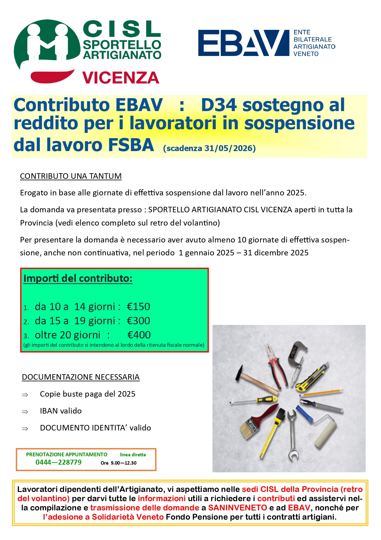 In primo piano Altre news Parlano di noi Foto Video PROCESSO PFAS Altre news 13/04/2026 Contributo EBAV: D34 sostegno al reddito CLICCA E SCARICA IL VOLANTINO CON GIORNI E ORARI DEI RECAPITIIN PROVINCIA DI VICENZA 1 2 3 4 5 6 7 8 9 10 ... > >> Torna all'elenco delle news