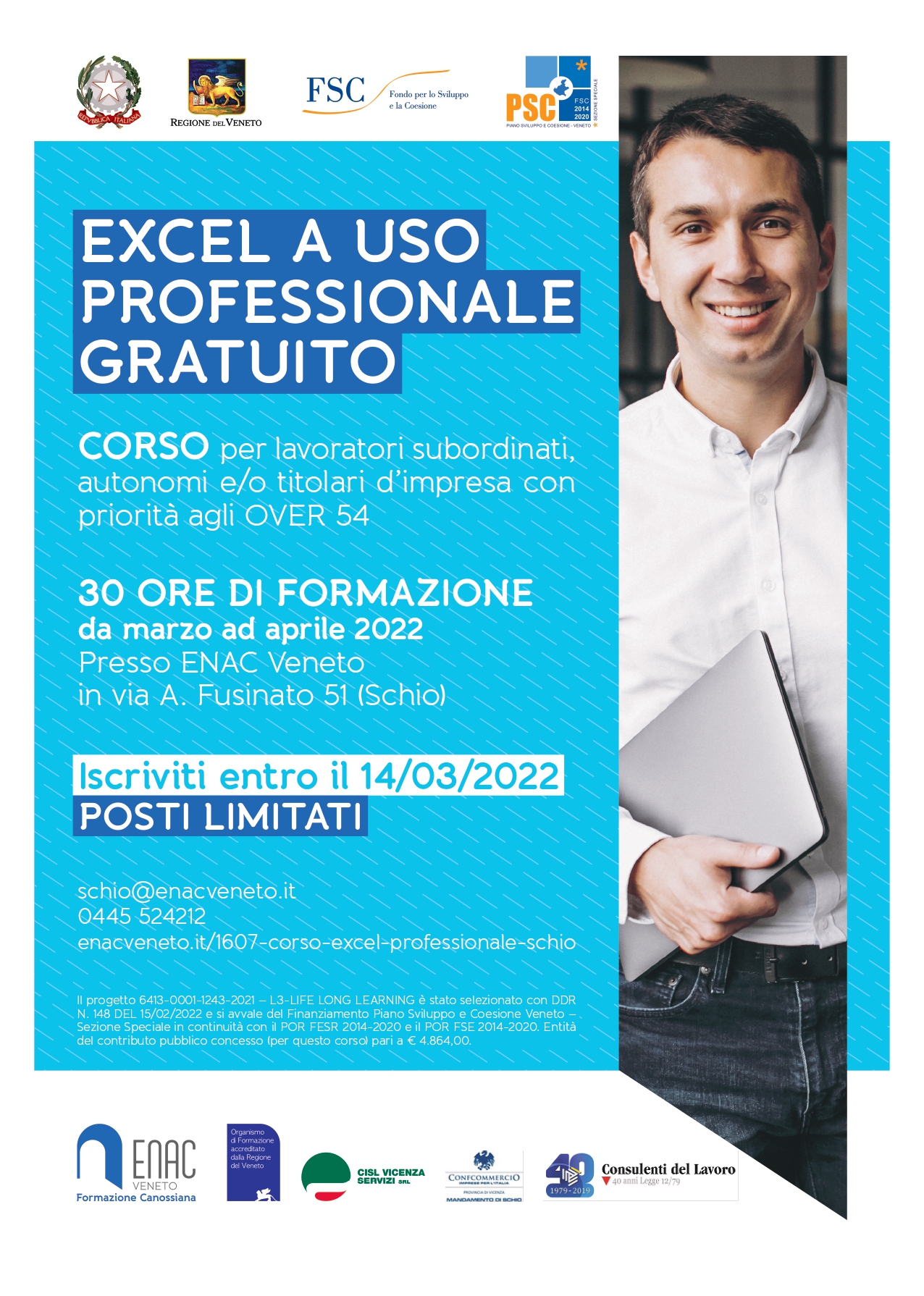 Excel è uno degli strumenti più efficaci per semplificare la vita lavorativa di ognuno di noi. Le potenzialità che offre per la gestione, l’analisi e l’organizzazione di dati di qualsiasi tipo lo rendono uno dei programmi più utilizzati nelle realtà professionali di ogni settore. Ecco perché ENAC Veneto apre le iscrizioni ad un nuovo corso di Excel, finanziato dalla Regione del Veneto e dedicato esclusivamente ai lavoratori. Il corso è aperto a 6 lavoratori che possono essere: Sarà data priorità ai lavoratori over 54, perché il percorso mira nello specifico a favorire l’occupazione e promuovere la riqualificazione professionale di figure Senior, ponendo particolare attenzione alle sfide poste dalla digital transformation. Per partecipare al corso è necessario inviare la domanda di ammissione, scaricabile dalla pagina web del corso: https://www.enacveneto.it/1607-corso-excel-professionale-schio La domanda, completa di tutti i documenti richiesti, dovrà essere inviata all’indirizzo email: schio@enacveneto.it entro le ore 10:00 del 14/03/2022. Il candidato sarà contattato dall’ente solo in caso di richiesta di perfezionamento documentazione, in caso contrario è tenuto a presentarsi alla selezione. Le selezioni si terranno presso la sede ENAC Veneto di Schio (via Fusinato 51) il giorno 14/03 alle ore 11. Per maggiori informazioni:Altre news