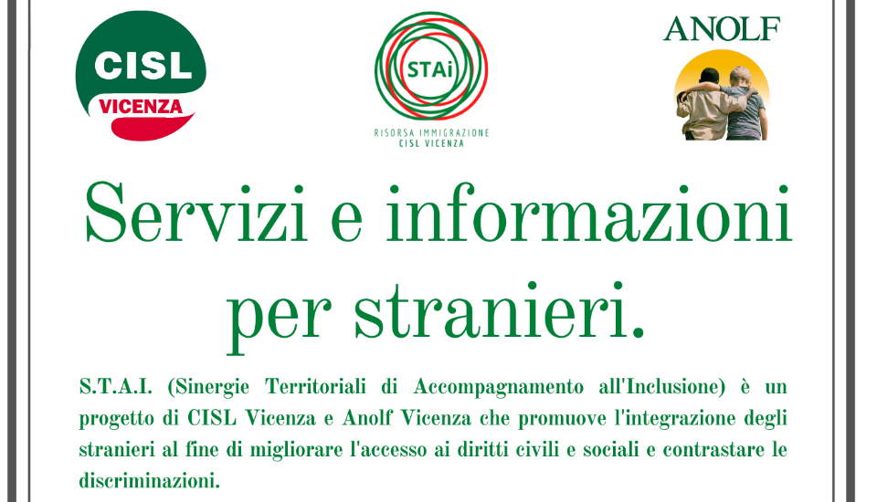 Il Progetto “Sinergie Territoriali di Accompagnamento all’Inclusione” (STAI) nasce dall’intesa tra CISL Vicenza, ANOLF Vicenza e un gruppo di operatori attivi nel sociale e nell’ambito delle politiche sull’immigrazione. Lo scopo del progetto è di creare una rete di servizi territoriali che riduca il rischio di esclusione sociale per i cittadini stranieri presenti nella provincia di Vicenza attraverso percorsi di orientamento, formazione e lavoro, con un approccio che metta al centro dell’azione l’utente con i suoi bisogni e le sue potenzialità.
